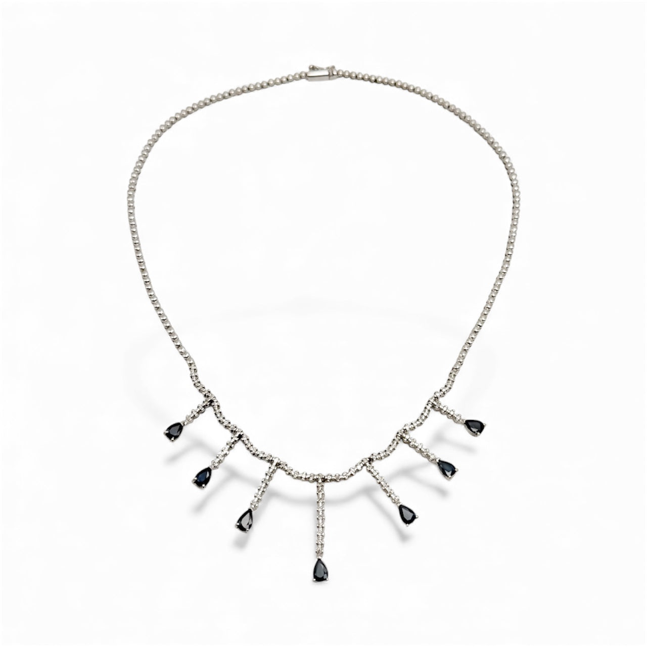 Pre-loved 14k white gold collar necklace featuring 0.79cttw of diamonds set in bars, each accented with dangling pear-shaped sapphire. Measuring 16 inches long and weighing 14.2dwt, this elegant piece blends vibrant color with sparkling sophistication for a timeless statement look.