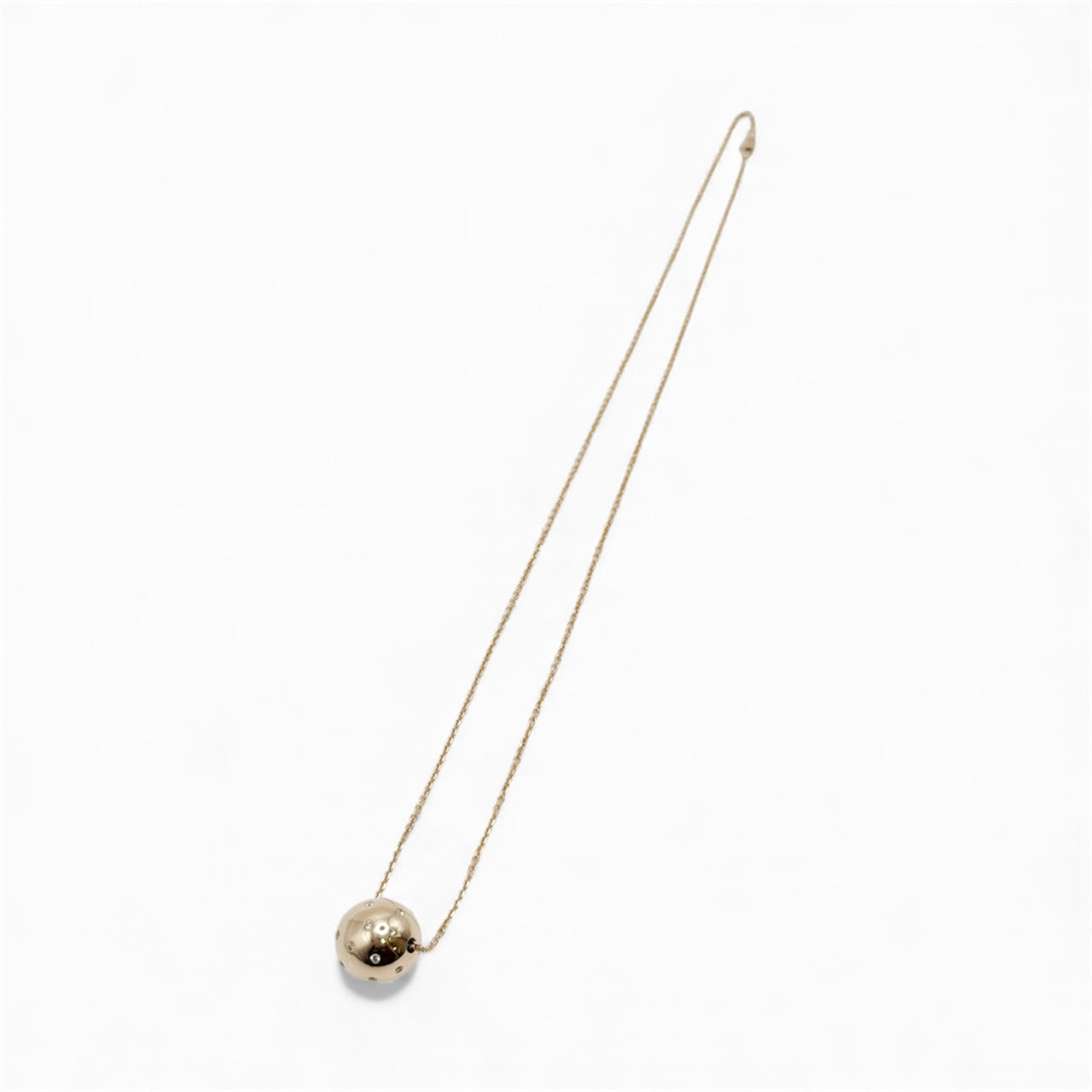 Pre-loved 14k yellow gold necklace featuring an 18mm polished sphere burnish-set with 0.62cttw of sparkling round diamonds. The elegant pendant is suspended from a 24-inch diamond-cut cable link chain, offering a refined balance of brilliance and sophistication—perfect for adding timeless luxury to any ensemble.