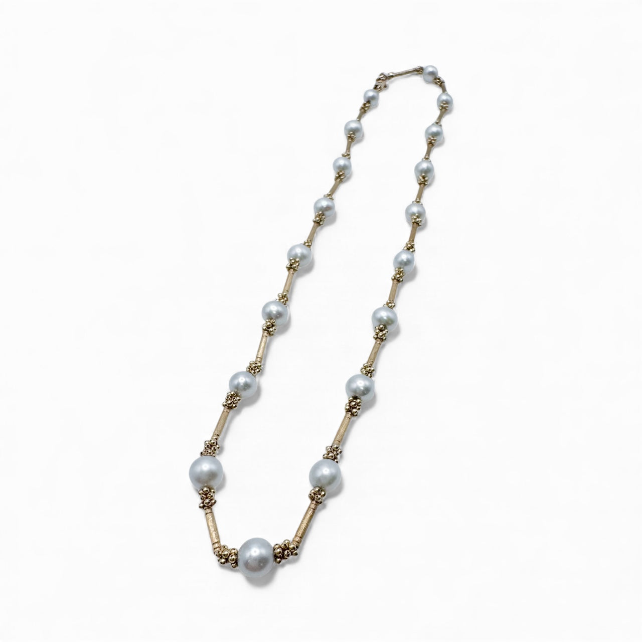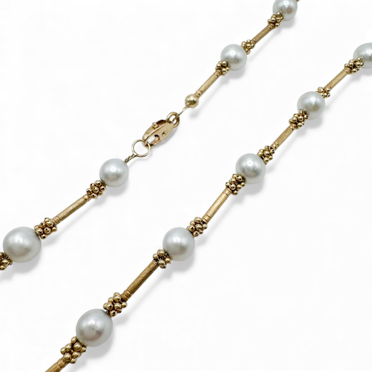 Pre-loved 14k yellow gold beaded pearl station necklace featuring lustrous 5mm round pearls, accented with gold bead clusters and bars for a refined, elegant design. Measuring 15 inches long and weighing 7.2 dwt, this necklace offers timeless sophistication, perfect for layering or wearing as a standout piece on its own.