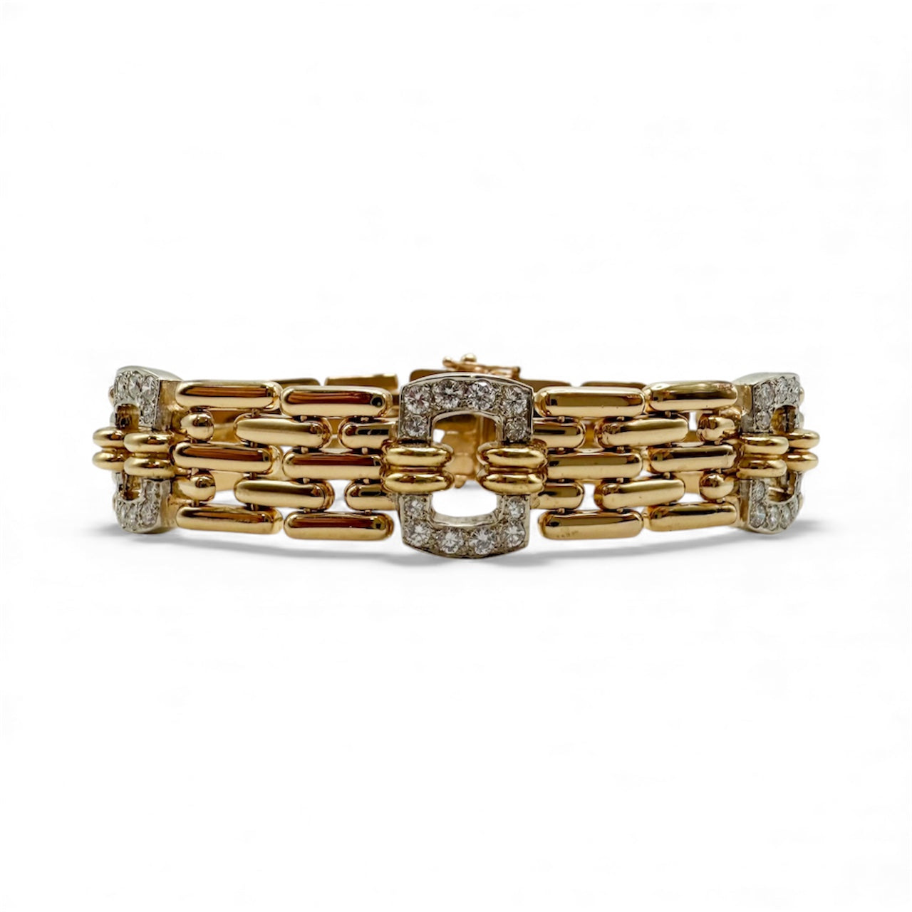 Elegant pre-loved 18k yellow gold Panther link bracelet featuring three sparkling diamond-accented links totaling approximately 1.20 carats. Measuring 7 inches in length and weighing 23.6 dwt, this luxurious bracelet showcases timeless craftsmanship and sophisticated design—perfect for adding refined brilliance to any jewelry collection.