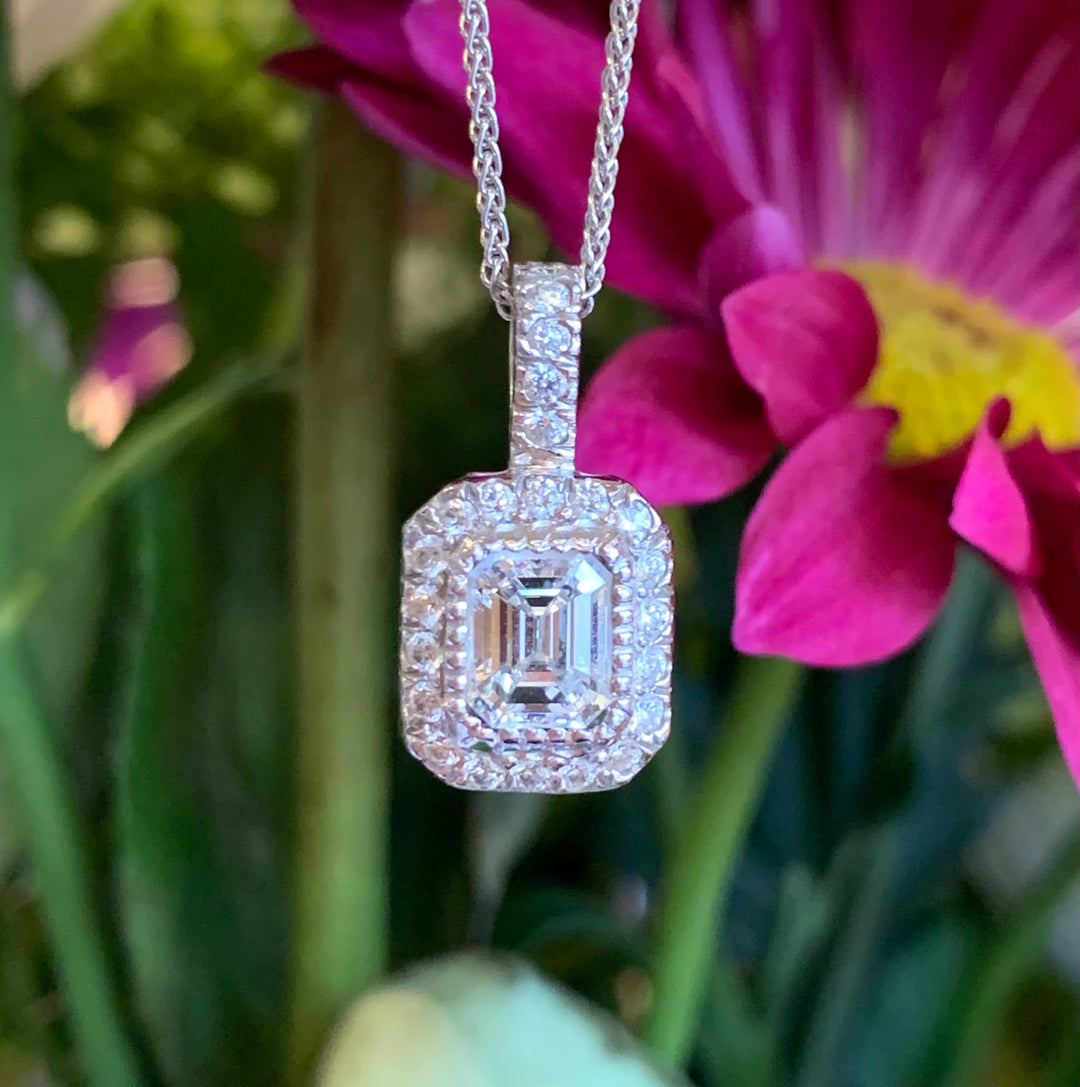 14k White Gold Halo Emerald Pendant