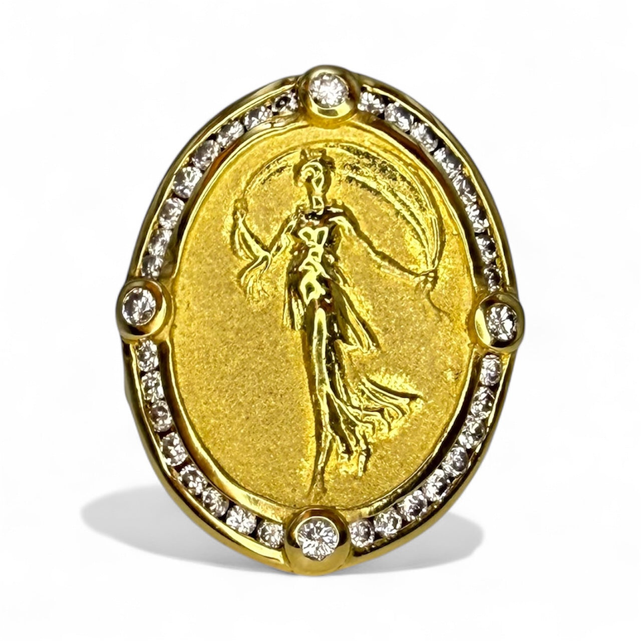 Elegant 18K yellow gold Seidengang “Odyssey” pre-loved ring showcasing timeless craftsmanship. The bold design features channel and bezel-set diamonds totaling approximately 0.76 carats, offering brilliant sparkle and refined detail. Weighing 10.5 dwt and sized at 6.5, this striking piece embodies classic luxury and sophistication.