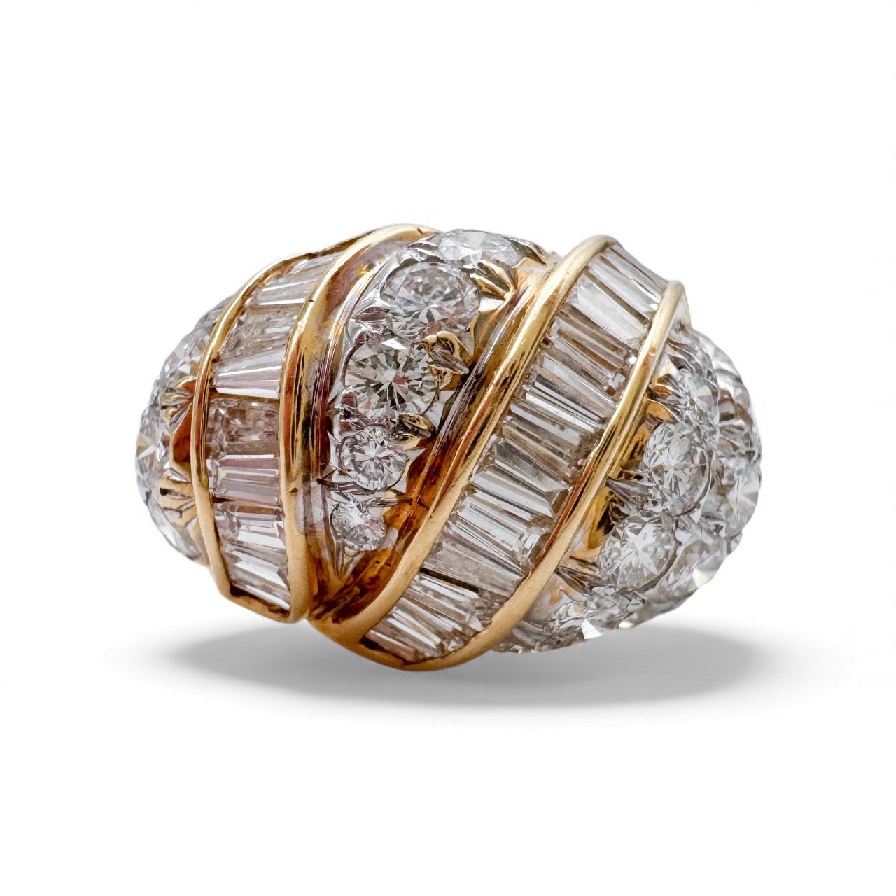 This elegant lady’s estate cluster ring is crafted in rich 18k yellow gold and showcases 4.50ct of sparkling round and baguette diamonds. Graded F/G with VS1 clarity, the stones deliver exceptional brilliance and fire. Weighing 6.4dwt, this striking vintage piece blends timeless luxury with bold, eye-catching design.