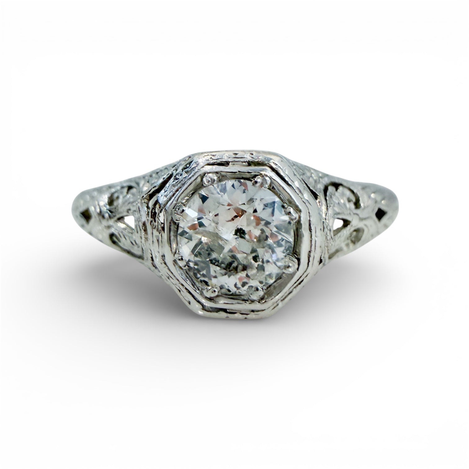 This elegant white platinum antique ring, size 7.25, features 0.38cttw of mine cut diamonds with an I2 clarity, offering a beautiful vintage look. Weighing 1.7 dwt, this piece combines classic design with subtle charm, perfect for those who appreciate antique craftsmanship and timeless elegance. A sophisticated addition to any jewelry collection.