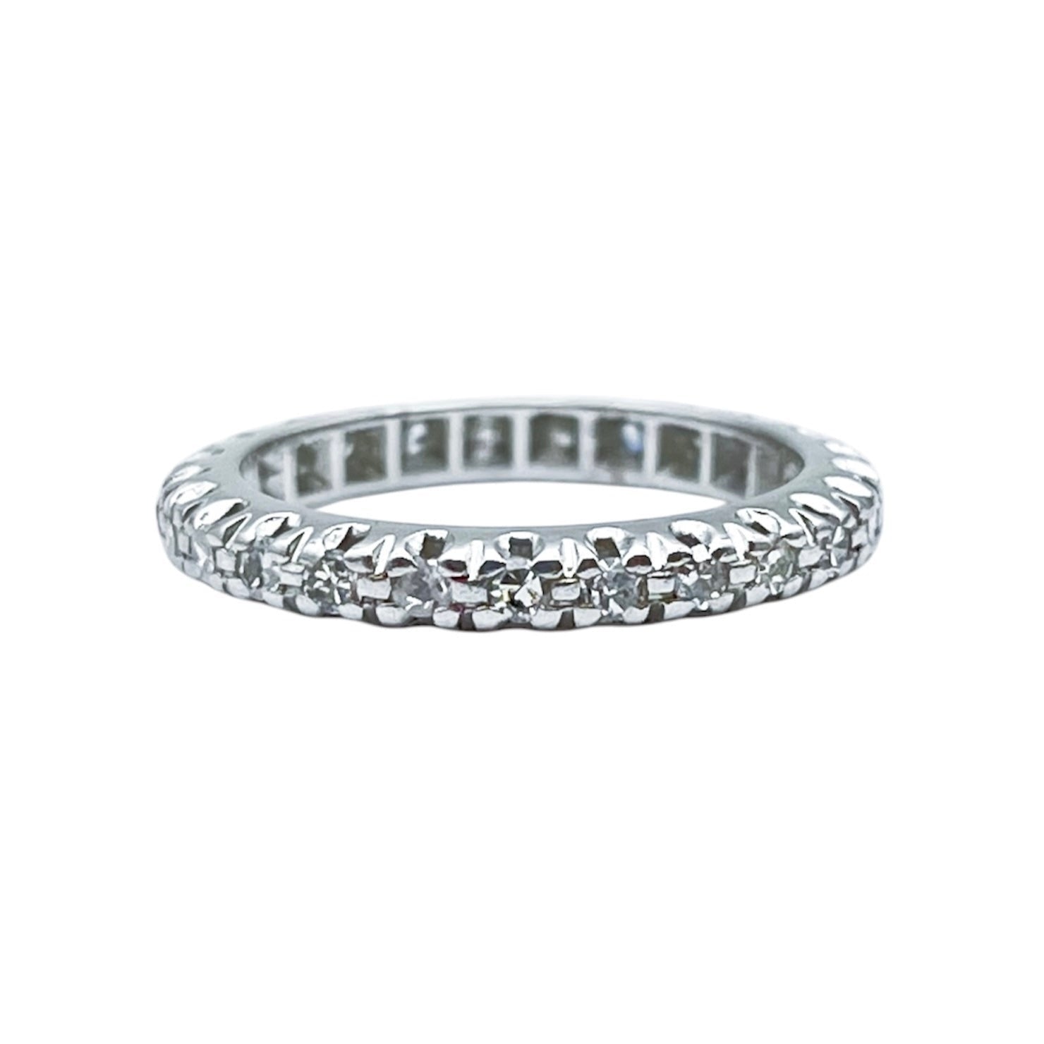 White platinum estate wedding band accented with round diamonds totaling 0.28 carats. The clean, timeless design offers subtle sparkle and classic elegance, perfect for everyday wear or stacking. Ring weighs approximately 2.9 dwt and showcases enduring craftsmanship and refined style.