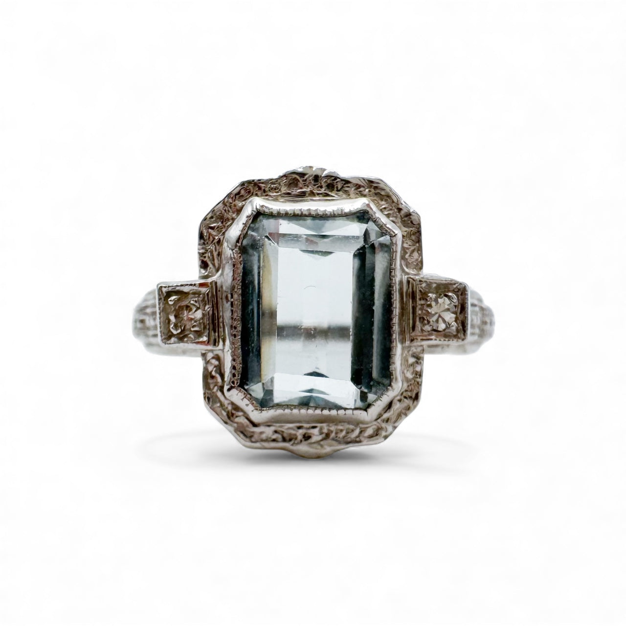 Pre-loved 14k white gold antique ring featuring an approx. 2.43 ct emerald-cut aquamarine, accented by 0.04 ct total weight in sparkling diamonds. Sized at 7.5 and weighing approx. 1.8 dwt, this elegant vintage-inspired ring combines refined sophistication with timeless charm.