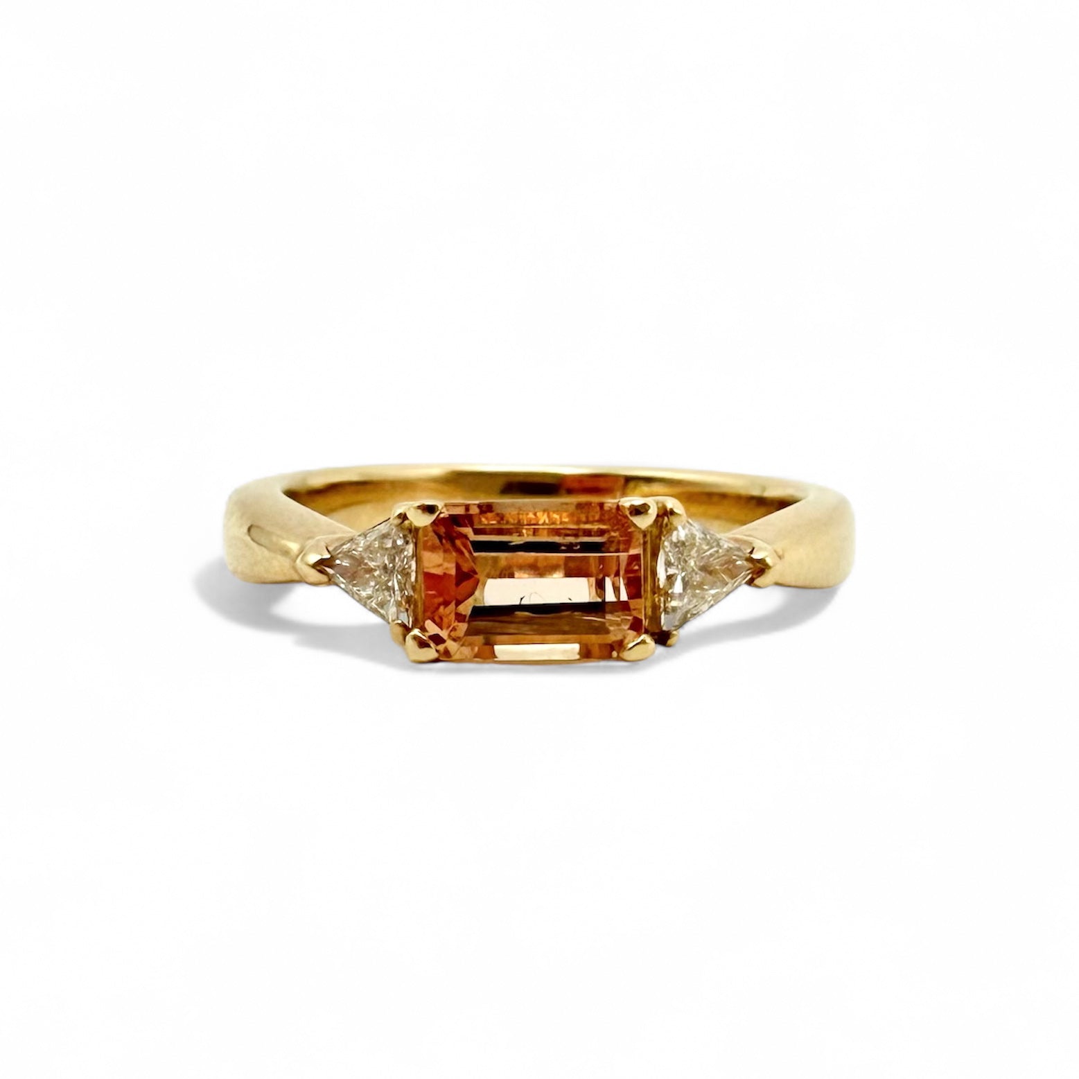 Elegant estate 14K yellow gold ring showcasing a vibrant 0.97ct emerald-cut Imperial topaz, beautifully accented by 0.17cttw sparkling trillion-cut diamonds. Crafted with timeless sophistication, this 2.7 dwt piece offers rich golden warmth and refined brilliance, perfectly sized at finger size 7.