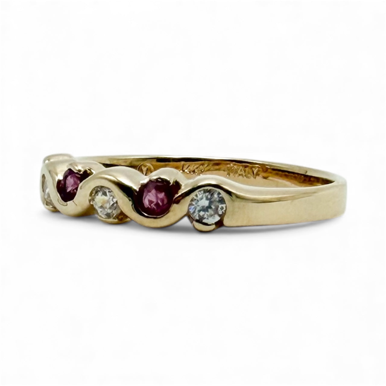 Elegant pre-loved 14k yellow gold band featuring a vivid ruby accented by sparkling cubic zirconias for a striking contrast of color and brilliance. Crafted in rich yellow gold, this timeless design exudes sophistication and charm. Weighing 1.5 dwt and sized at 7, it’s a beautiful piece for everyday elegance or special occasions.
