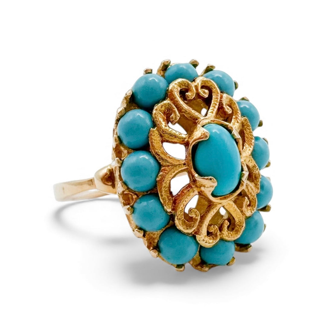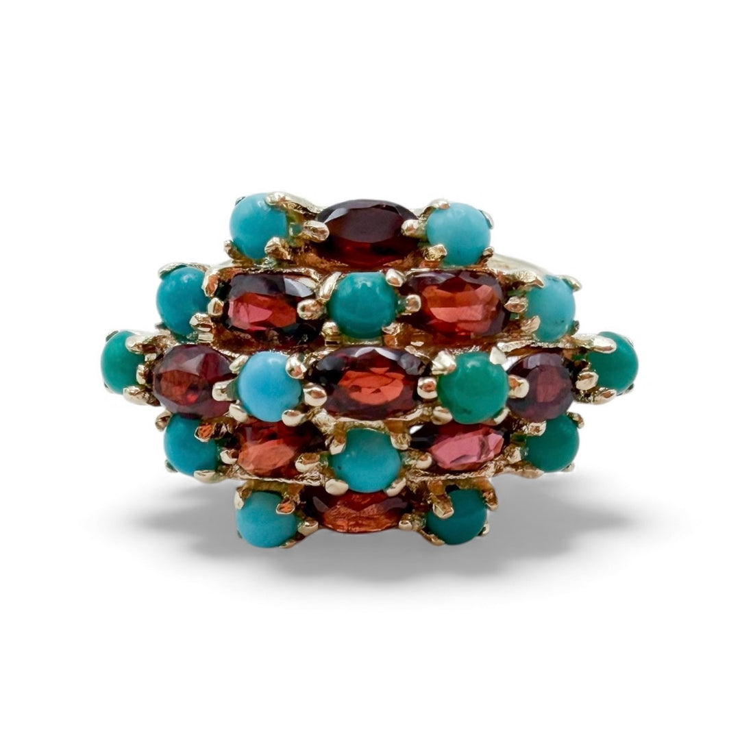 14k Yellow Gold Cluster Turquoise Garnet Estate Ring