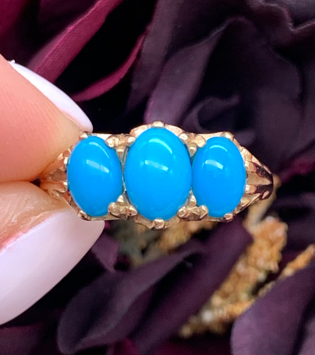 14k Yellow Gold 3 Stone Turquoises Estate Ring