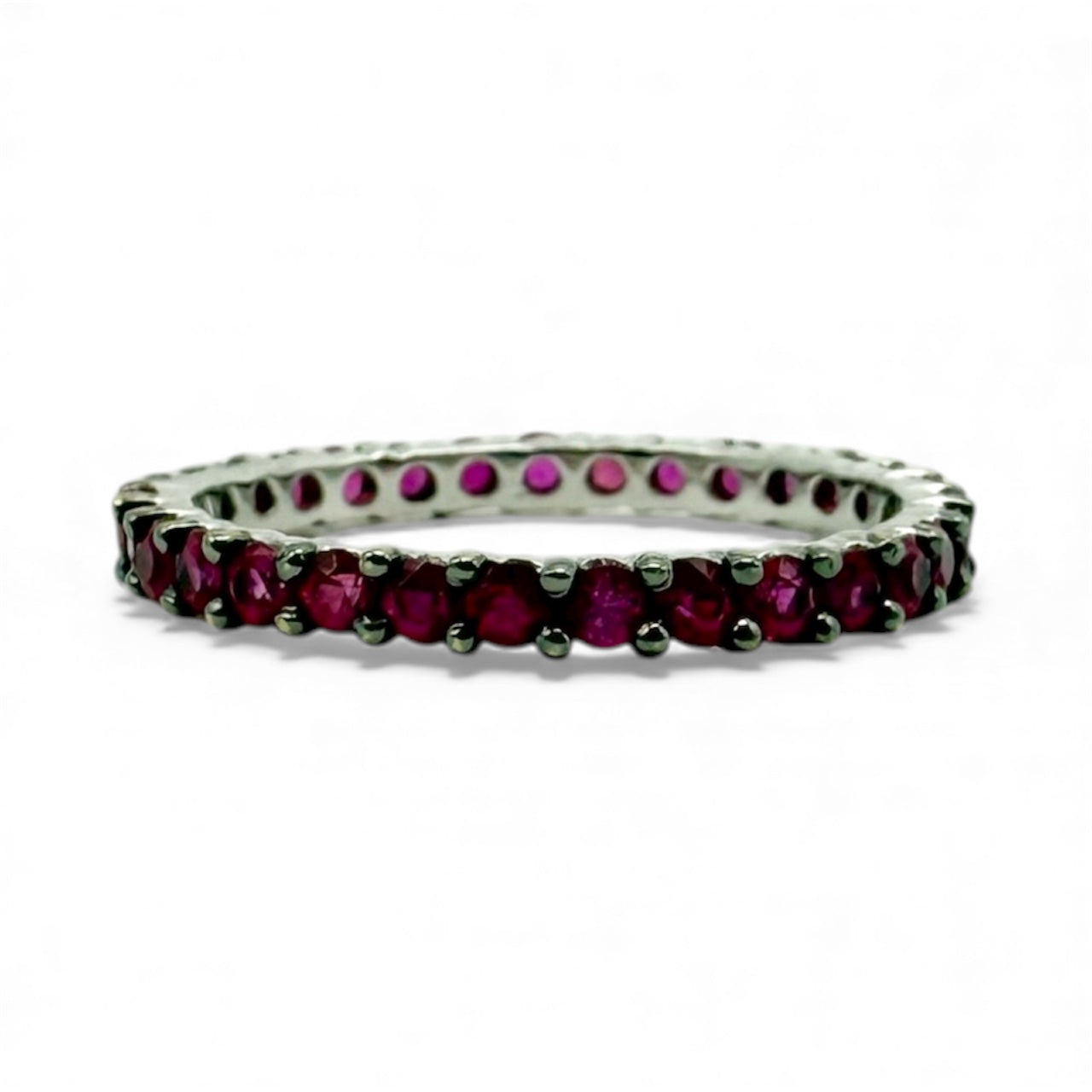 Pre-loved 10K white gold band featuring vibrant lab-created rubies set against a striking dark rhodium finish. This size 8 ring, weighing 1.4 dwt, offers a bold yet elegant contrast of color and shine—perfect for adding a touch of modern sophistication to any jewelry collection.