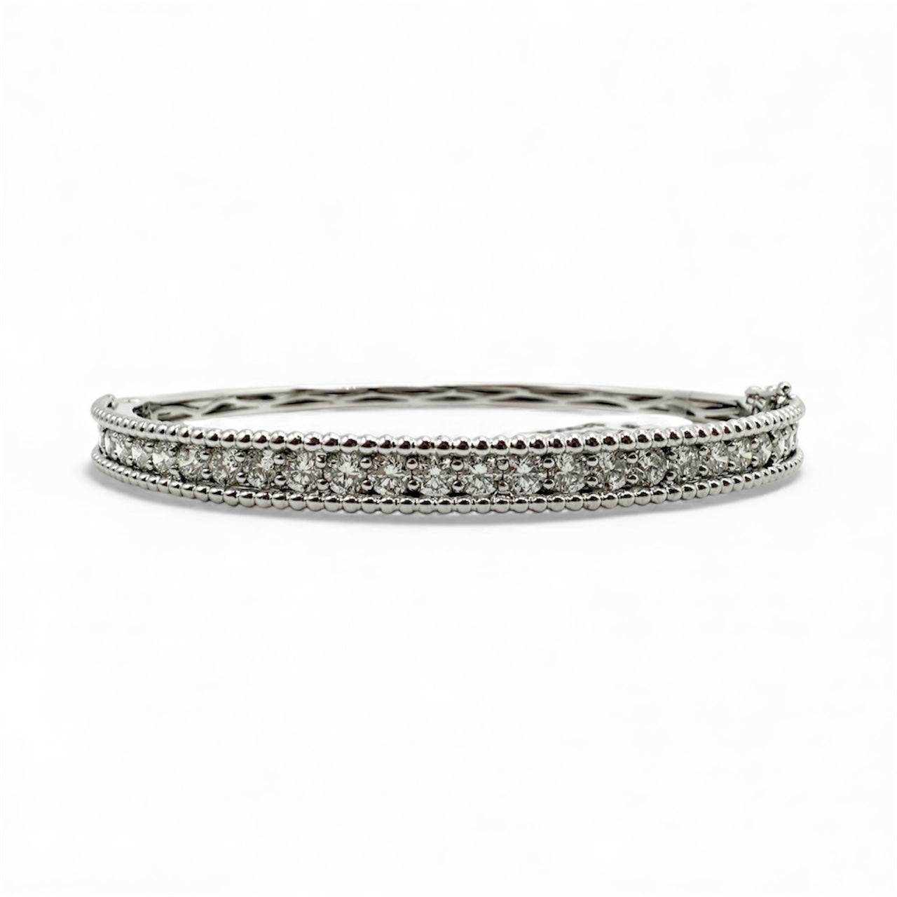 Elevate your elegance with this 14k white gold diamond bangle bracelet, featuring refined beaded edges for added texture and charm. Set with 2.64 cttw of sparkling diamonds, it delivers radiant brilliance from every angle. Weighing 11.1 dwt, this luxurious bangle offers a timeless, sophisticated look perfect for any occasion.