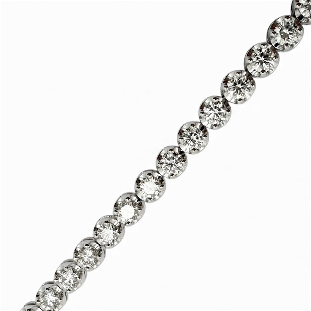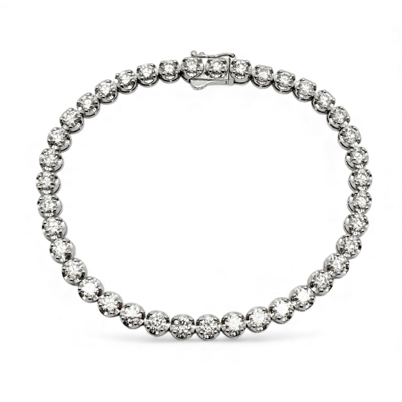 A timeless 14K white gold tennis bracelet showcasing 5.20cttw of sparkling round natural diamonds, each set in elegant four-prong rounded basket settings for secure, fluid brilliance. Measuring 7 inches long and weighing 6.4dwt, this classic design offers enduring sophistication and radiant, everyday luxury.