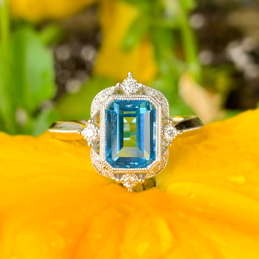 This 14K white gold ring showcases a stunning 1.40ct emerald-cut blue topaz, framed by 0.09cttw of pavé-set diamonds in a decorative halo with vintage-inspired milgrain detailing. Finger size 7, it’s a timeless and elegant piece that blends classic charm with modern sparkle.