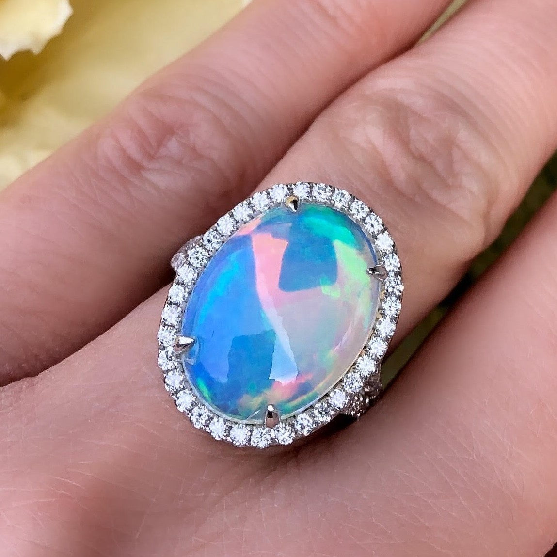 This 14K white gold fashion ring showcases a stunning 6.23ct oval Ethiopian opal, surrounded by a dazzling halo of 0.78cttw round diamonds. The elegant split shank adds a modern touch, highlighting the vibrant play-of-color in the opal. Sized at 6.5, this ring combines bold beauty with timeless sophistication.