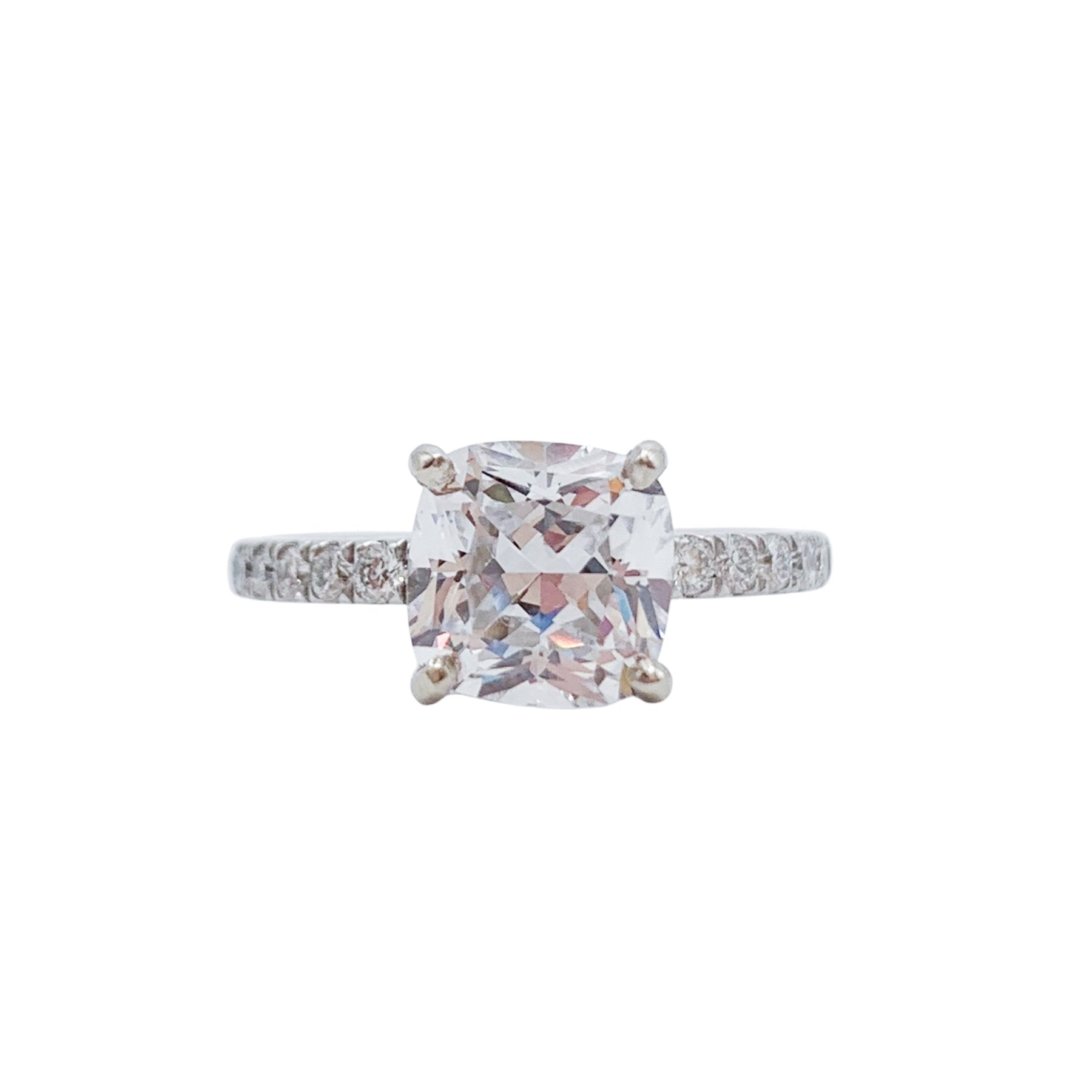 This 14K white gold engagement ring mounting features 0.57cttw of round lab-grown diamonds elegantly set along the band. At its center, it holds an approximately 2.20ct cushion-cut cubic zirconia (7.5 x 7.5mm), offering brilliant sparkle and timeless style. Sized at 6 1/2 and weighing 1.8dwt, it's a beautifully crafted and affordable engagement option.