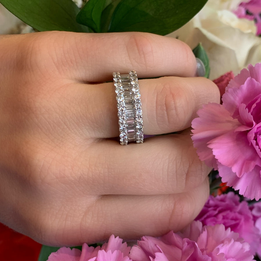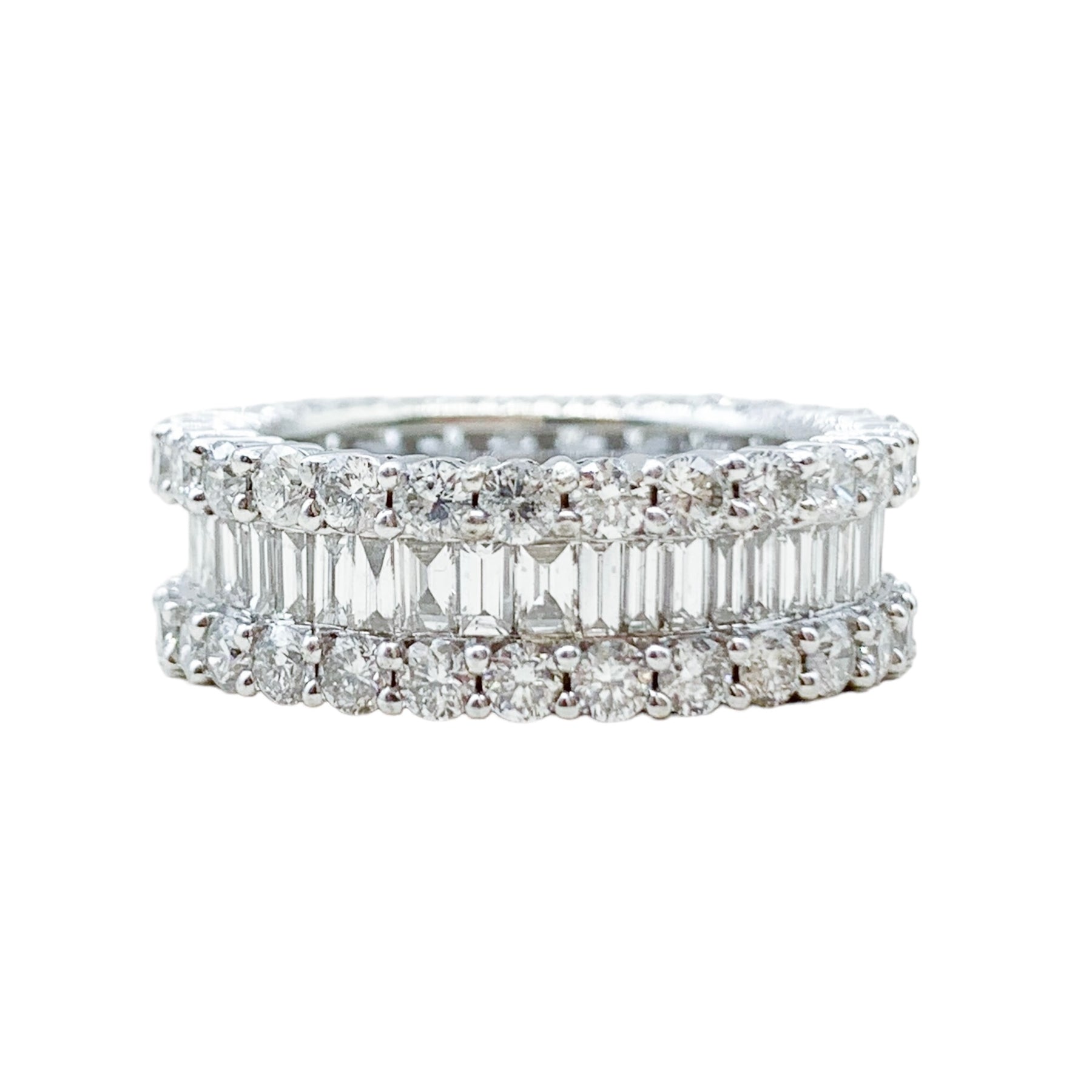 This lady’s 18k white gold wedding band features 1.68 cttw of baguette diamonds complemented by 2.69 cttw of round brilliant diamonds, creating a stunning display of sparkle and elegance. Expertly crafted, this timeless band combines classic sophistication with contemporary style, making it perfect as a wedding band, anniversary ring, or a luxurious addition to any fine jewelry collection.