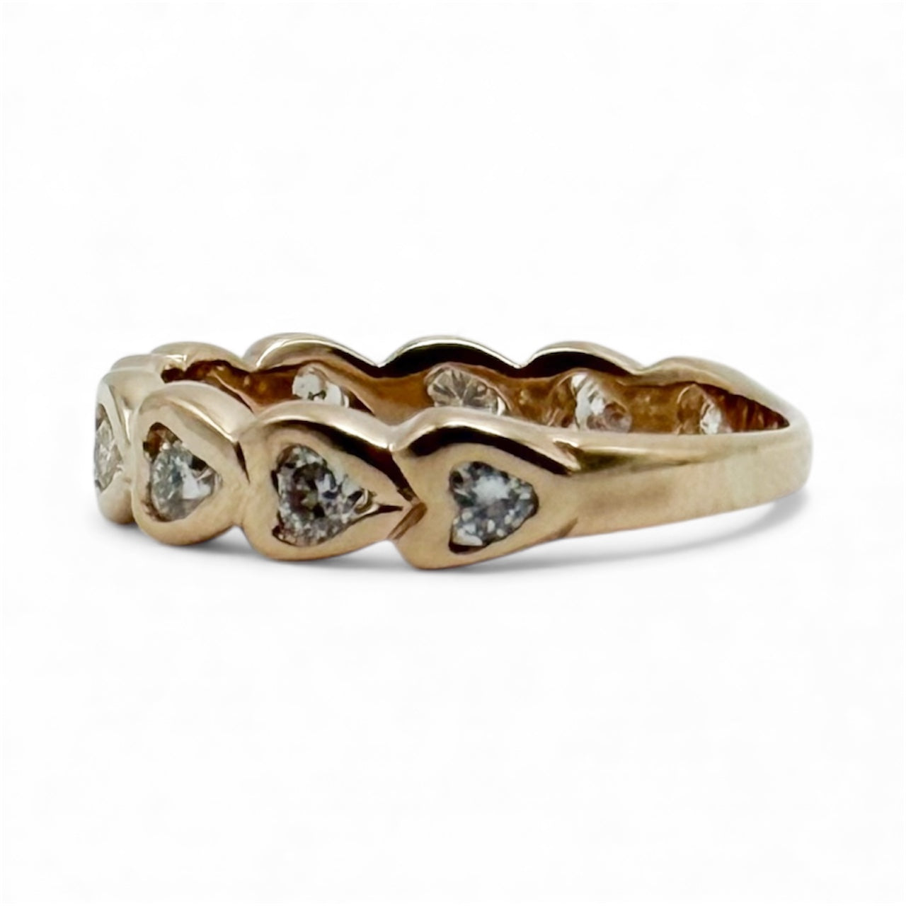 Charming pre-loved 14k yellow gold heart band featuring sparkling round diamonds totaling approximately 0.30 cttw. Crafted in warm yellow gold, this romantic design showcases elegant heart detailing for a timeless, feminine look. Weighing 1.3 dwt and sized at a petite 5, this ring makes a perfect gift or sentimental keepsake.