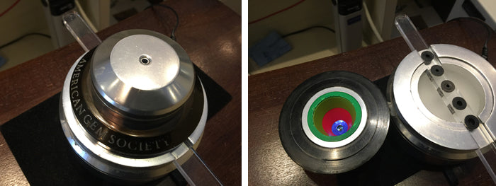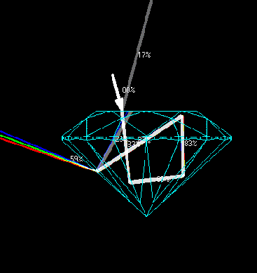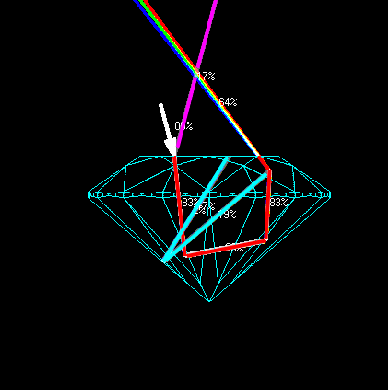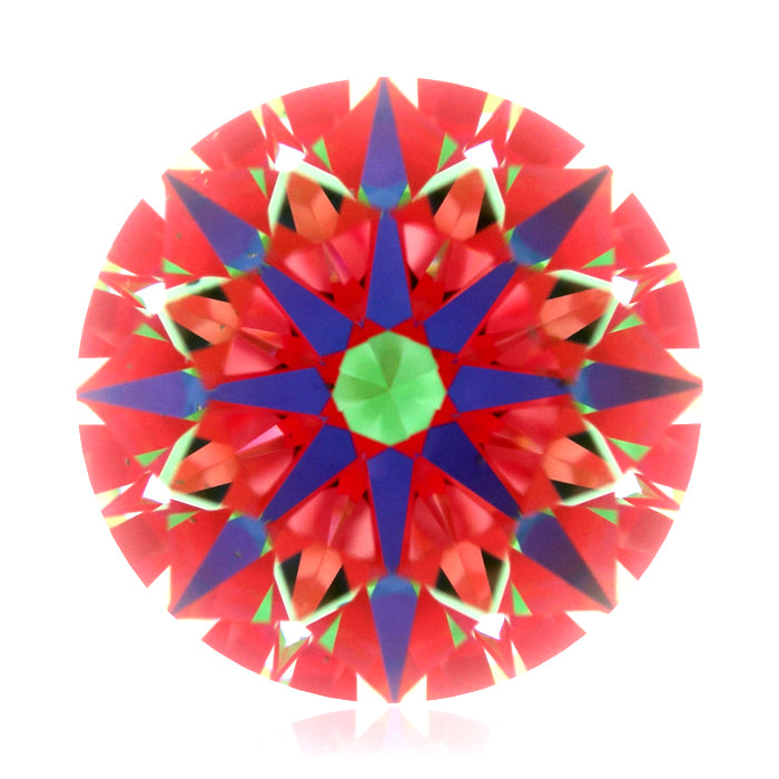 The Aset or light-scope concept is that a diamond's light will either reflect at you or it will go through the diamond in essence leak light. The light return part is broken up in a few ways. It will either come fully straight up at 75-90 degrees (blue reflection), 45-75 degrees (red reflection), or 0-45 degrees (green light). Ultimately you want the majority to be red with some contrast of blue and greens being a secondary light. Studies show that it produces the best brilliance. Any deviation of that would show less brilliance. The image examples will show this. The chart below is our main gauge with regard to categorizing the round diamonds. Then the white will be a straight leakage. This will always be a negative. A little white leakage is ok and most diamonds have some to a degree. Excessive light leakage will produce a lesser brilliant diamond.