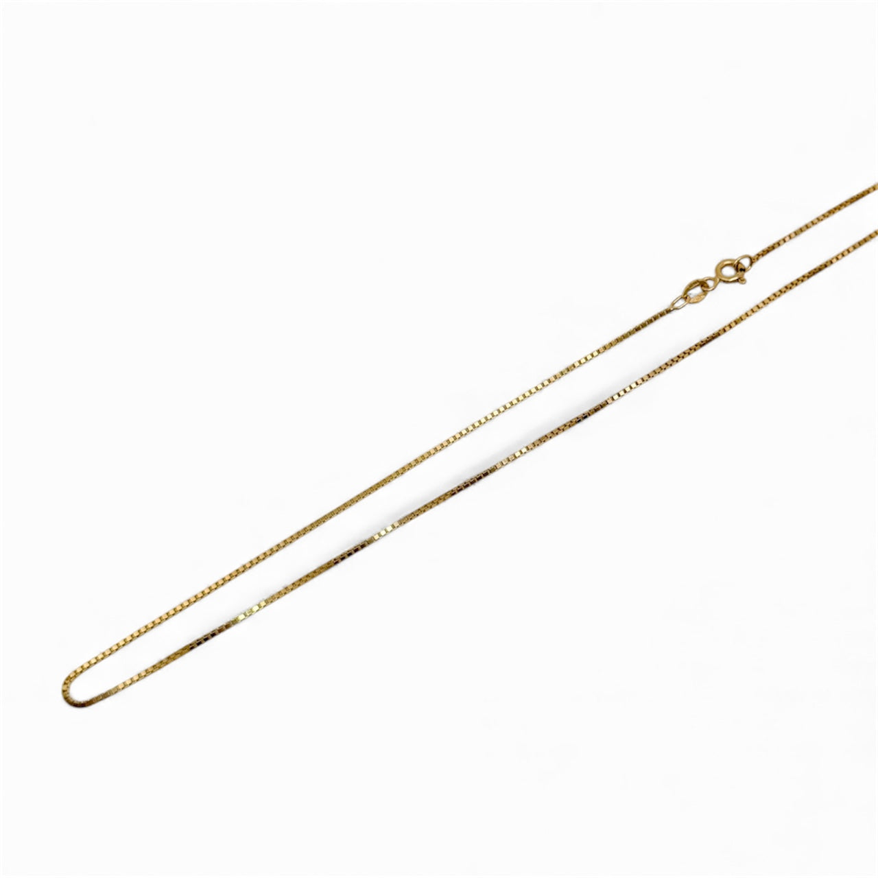 Classic pre-loved 14K yellow gold box chain measuring 18 inches in length and 1mm in width, weighing 1.9 dwt. This sleek and versatile chain features a polished finish and sturdy design, perfect for showcasing pendants or wearing alone for a timeless, elegant look.