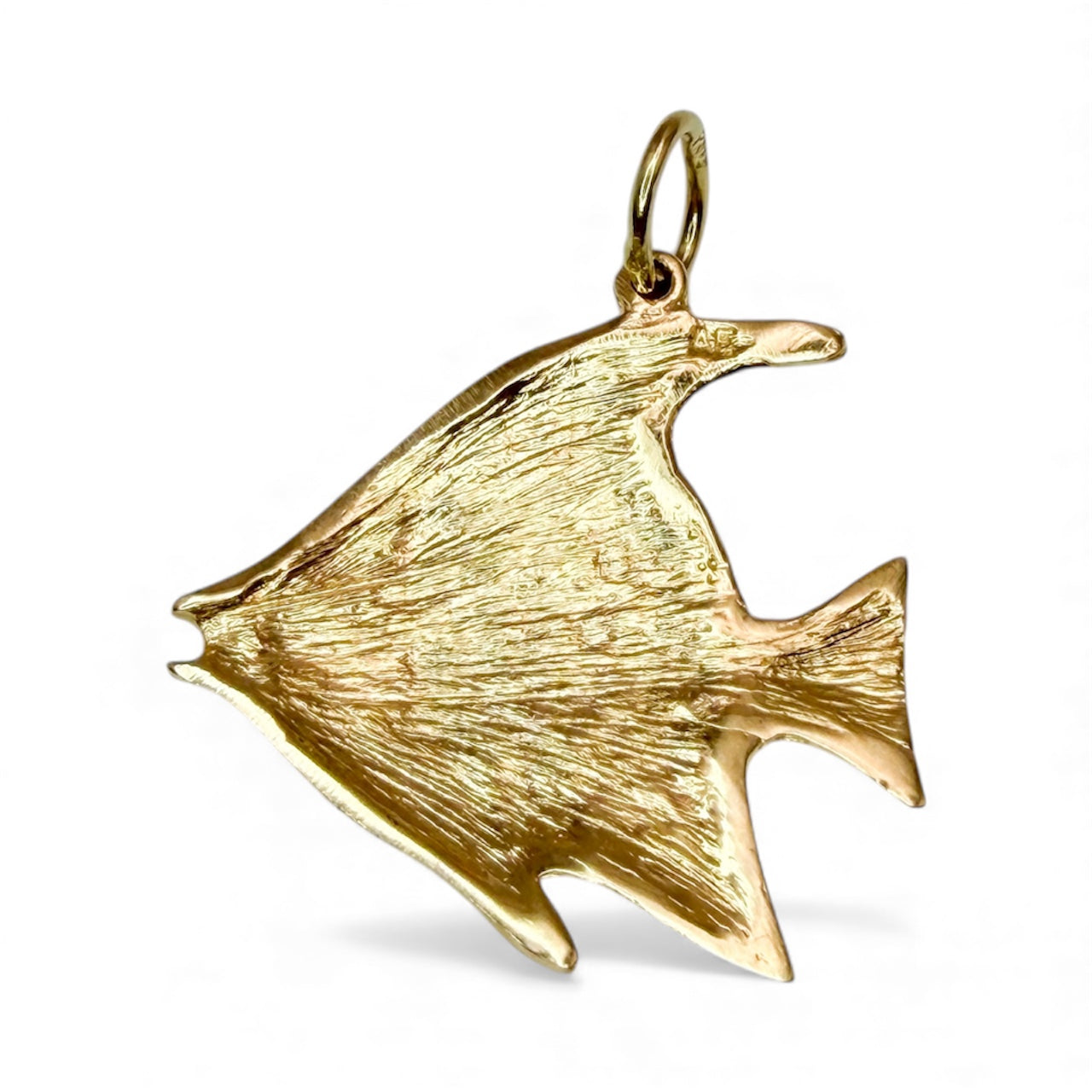 Charming pre-loved 14k yellow gold angelfish pendant measuring 26mm x 26mm and weighing 2.3 dwt. Beautifully detailed with graceful lines and polished finish, this nautical-inspired piece captures the elegance of the sea, making it a unique and stylish addition to any fine jewelry collection.